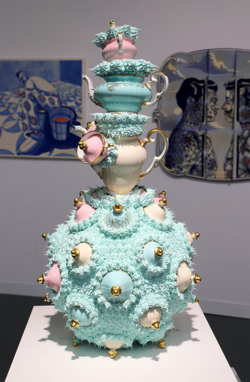 Ce qui frappe c’est la place donnée au néo baroque mettant en scène la vie animale comme Carolein Smit chez Jonathan Kugel les assemblages réinterprétant l’histoire de la porcelaine d’Anka Eilergerhard chez Anna Laudel, les compositions mouvementés du jeune Onno Theelen chez Olivier Cataing…
